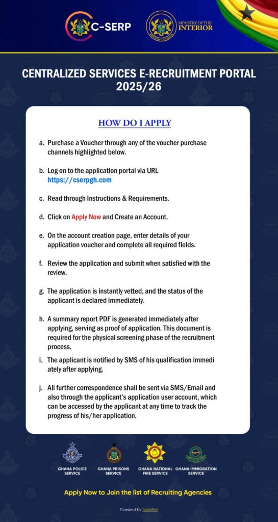 The nationwide recruitment exercise for Ghana’s internal security agencies officially begins on Monday, November 17, 2025, as the Centralised Services E-Recruitment Portal (C-SERP) opens for applications at 12 noon. The portal will remain active until Friday, December 19, 2025, giving prospective candidates one month to apply to join the Ghana Police Service, Ghana Immigration Service, Ghana National Fire Service, and Ghana Prisons Service.